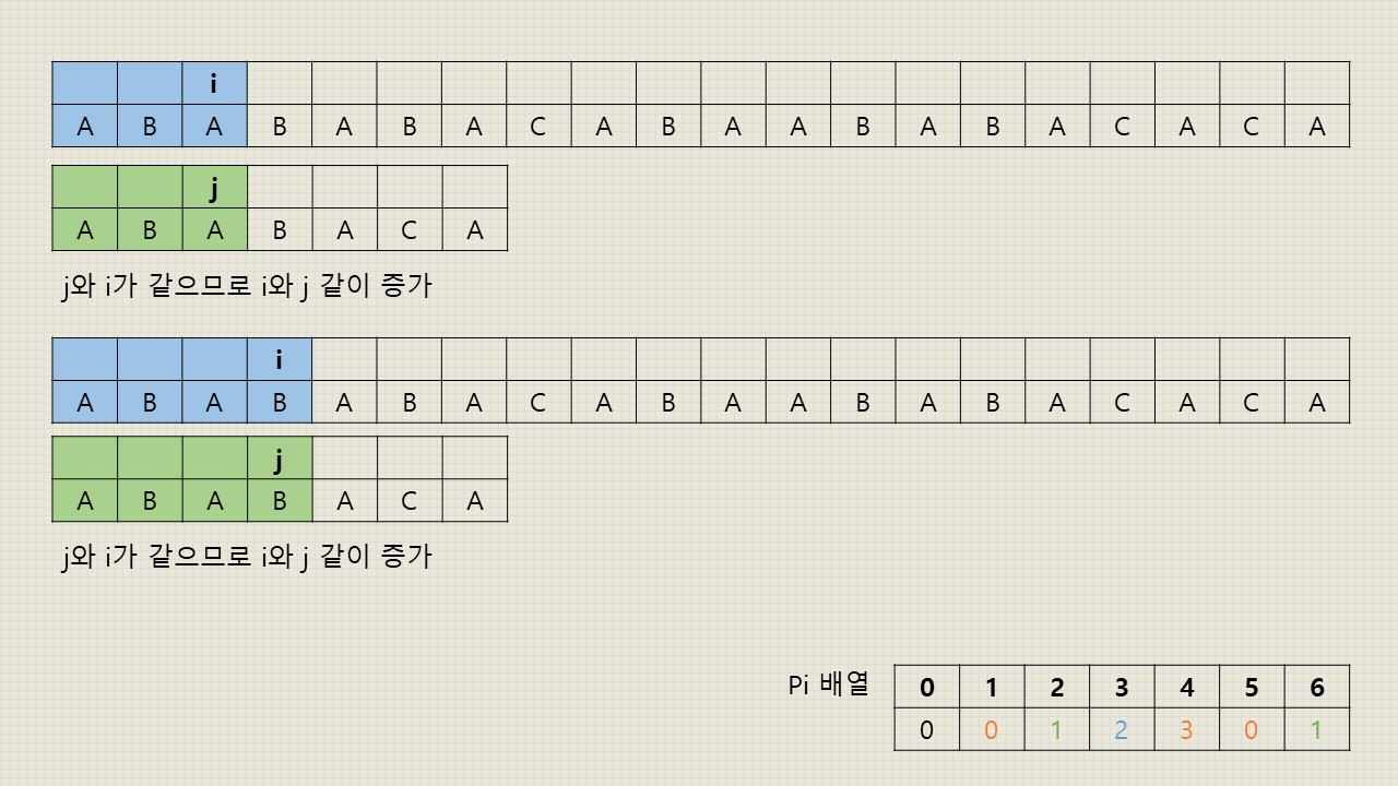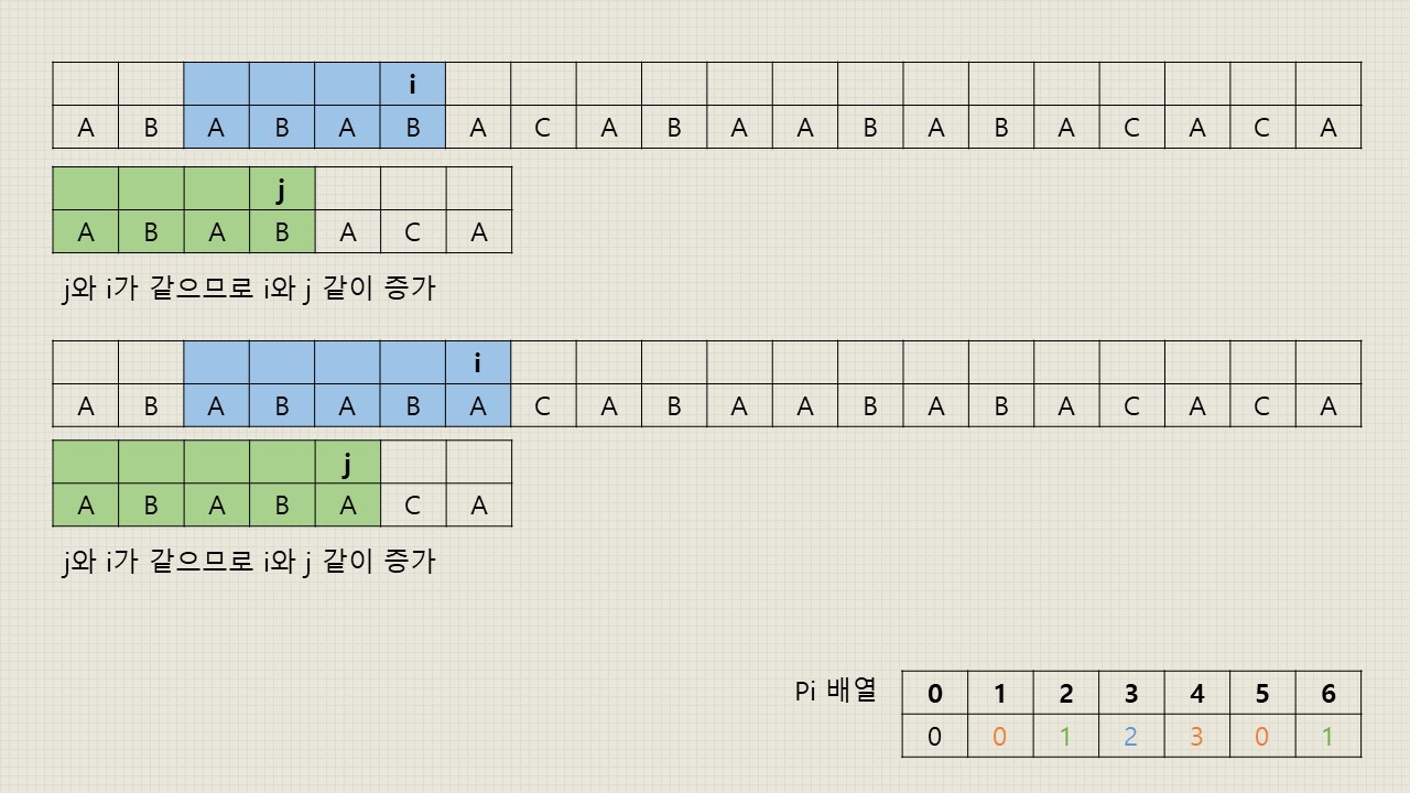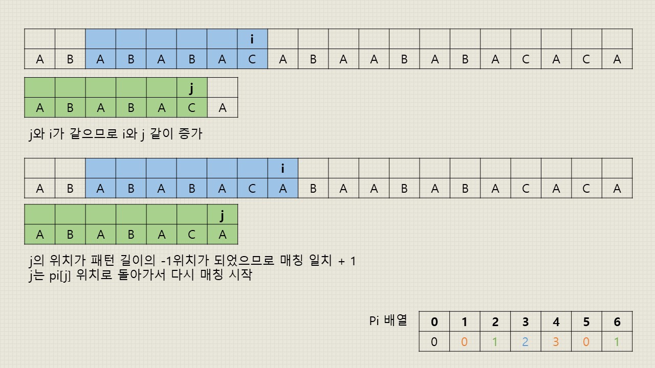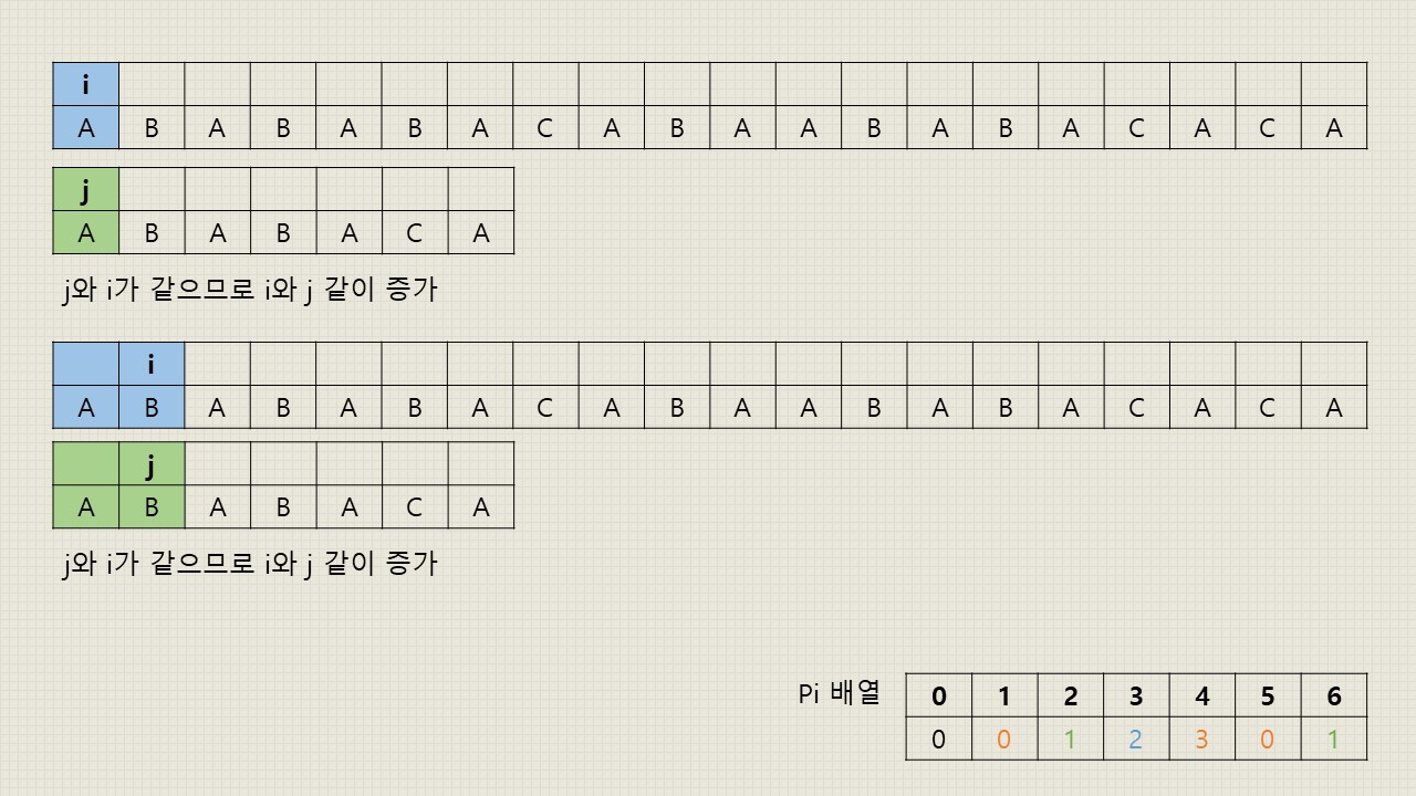 - j 위치의 문자열과 i 위치의 문자열이 일치했을 경우: 그 위치에서 접두사와 접미사가 일치했다는 것이므로 다음 위치의 j와 i의 문자열도 일치하는지 검사해야 합니다. 따라서 j와 i의 위치를 한 칸씩 오른쪽으로 이동해줍니다.