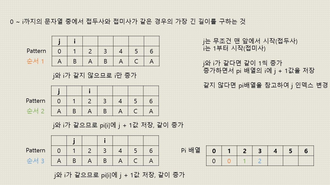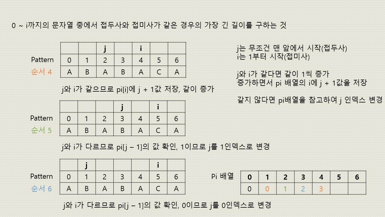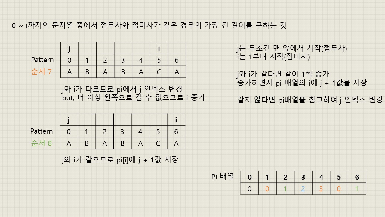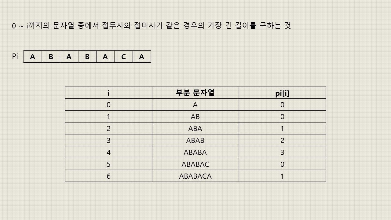 - 여기서 pi 배열이란 0 ~ i까지의 부분 문자열에서 접두사와 접미사가 얼마나 일치하는지 저장해놓은 배열입니다.