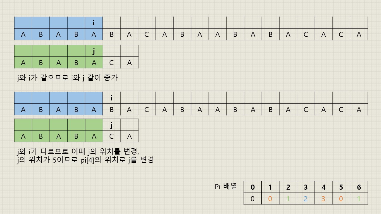 - j 위치의 문자열과 i 위치의 문자열이 일치하지 않을 경우: 접두사와 접미사가 일치하지 않는다는 것이므로 다시 검사를 해야하는데 이때 아예 처음으로 돌아갈 수도 있으나 비효율적입니다. 그래서 여태까지 일치했던 곳에서부터 다시 검사를 하는 것이 유리합니다. 따라서 pi배열을 참고하여 j의 위치를 pi[j - 1]에서 가리키는 위치로 이동시켜봅니다. j - 1인 이유는 최소 j - 1 위치까지는 접두사와 접미사가 일치했다는 것이므로 이동을 최소화할 수 있기 때문입니다. 이동을 시킨 후 다시 일치하는지 검사를 합니다.