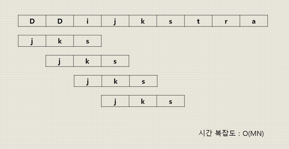 기존에 있는 문자열을 처음부터 끝까지 차례대로 순회하면서 패턴과 일치하는지 일일이 확인하는 방식으로 동작하게 됩니다. 기존 문자열을 패턴 길이만큼 비교해보기 때문에 시간 복잡도는 O(문자열 길이 * 패턴 길이)가 됩니다.