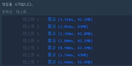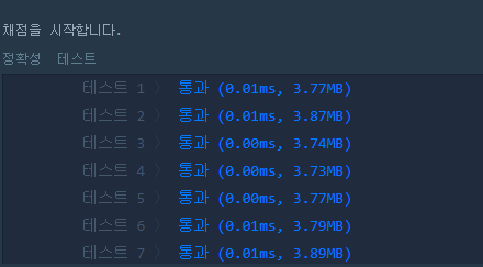 #include <string> #include <vector> #include <iostream> using namespace std; int solution(vector<int> priorities, int location) { int answer = 0; int size = priorities.size(); while(size != 0){ bool isCheck = false; int first = priorities[0]; for(int i = 1; i < priorities.size(); i++){ int tmp = priorities[i]; if(first < tmp) { isCheck = true; break; } } if(isCheck){ //첫 번째 원소보다 큰 수가 존재하는 경우 priorities.erase(priorities.begin()); priorities.push_back(first); if(location == 0) location = priorities.size() - 1; else location--; } else { //첫 번째 원소가 가장 큰 경우 priorities.erase(priorities.begin()); ++answer; if(location == 0) break; else location--; } size = priorities.size(); } return answer; }실행 결과
