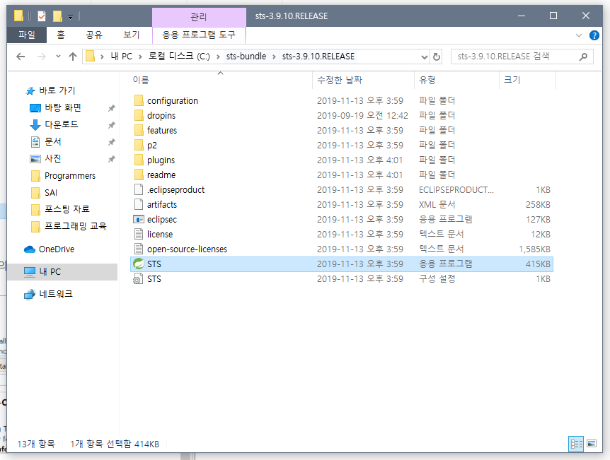 [sts-bundle] -> [sts-3.9.10.RELEASE]를 누르면 STS.exe 파일을 볼 수 있습니다. 실행해주세요!